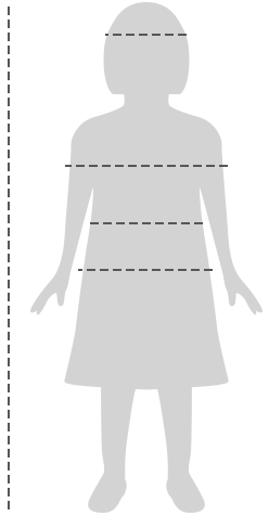 A Longueur Mesure votre enfant sans chaussures du sommet de la tête aux talons B Tour de poitrine Mesure le tour de poitrine de votre enfant à l'endroit le plus large C Dessous de poitrine Mesure le tour de taille de votre enfant à l'endroit le moins large D Tour de hanche Place les pieds bien côte à côte, et mesure à l'endroit le plus large des hanches